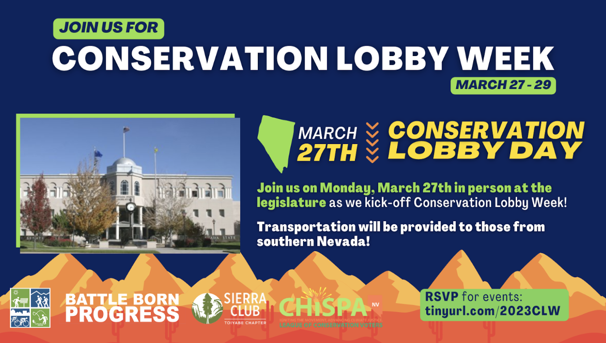Friend, Join our friends at Nevada Conservation League and other environmental partners as they rally for pro-environmental policies at the #NVLeg! From creating wildlife crossings that prevent wildlife and vehicle collisions to funding the outdoor recreation grant that provides opportunities for low income students to access the outdoors, there is a lot of work to do. This is YOUR chance to tell your legislators to push forward policies that help our state transition to a cleaner, healthier, and equitable future. You can join NCL on March 27th for Conservation Lobby day as they kick off a week of activities dedicated to protecting our lands and our planet! Transportation will be provided to those joining from southern Nevada. Thank you!